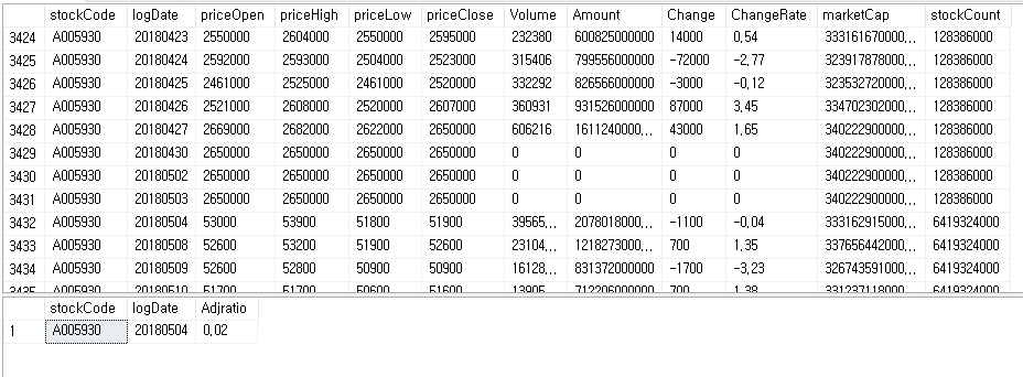 삼성전자의 경우 2018년 5월 4일 0.02의 주가주성을 DB에 기록해 둔다.