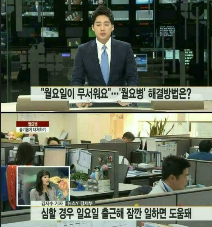 한때 월요별 해결 방법이라며 일요일에 잠깐 출근해서 일하면 도움된다는 슬기로운 해법이 뉴스에 나와서 직장인들의 공분을 사기도 했다.